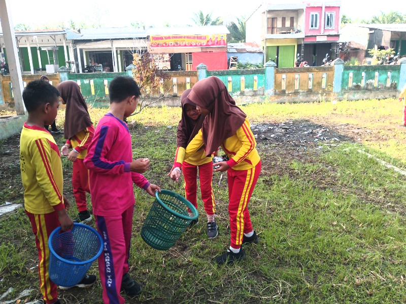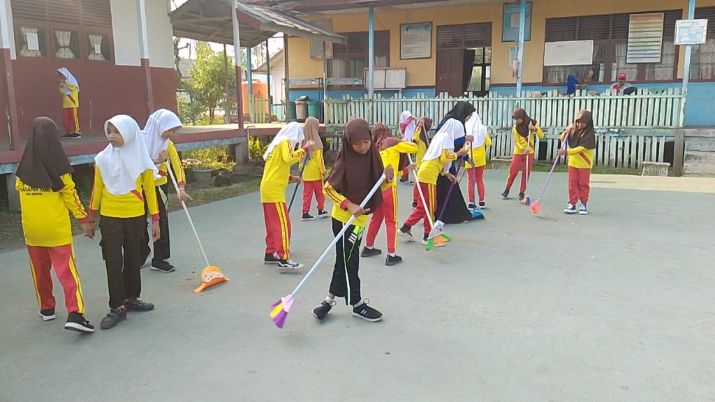 “Setelah ini, kita akan bergotong royong membersihkan lingkungan sekolah. Kita akan menyapu halaman, memungut sampah, dan membuangnya ke tempat sampah yang telah disediakan. Semua dilakukan bersama‑sama dengan semangat dan penuh kegembiraan,” ujar Bapak Said Yusnedi.